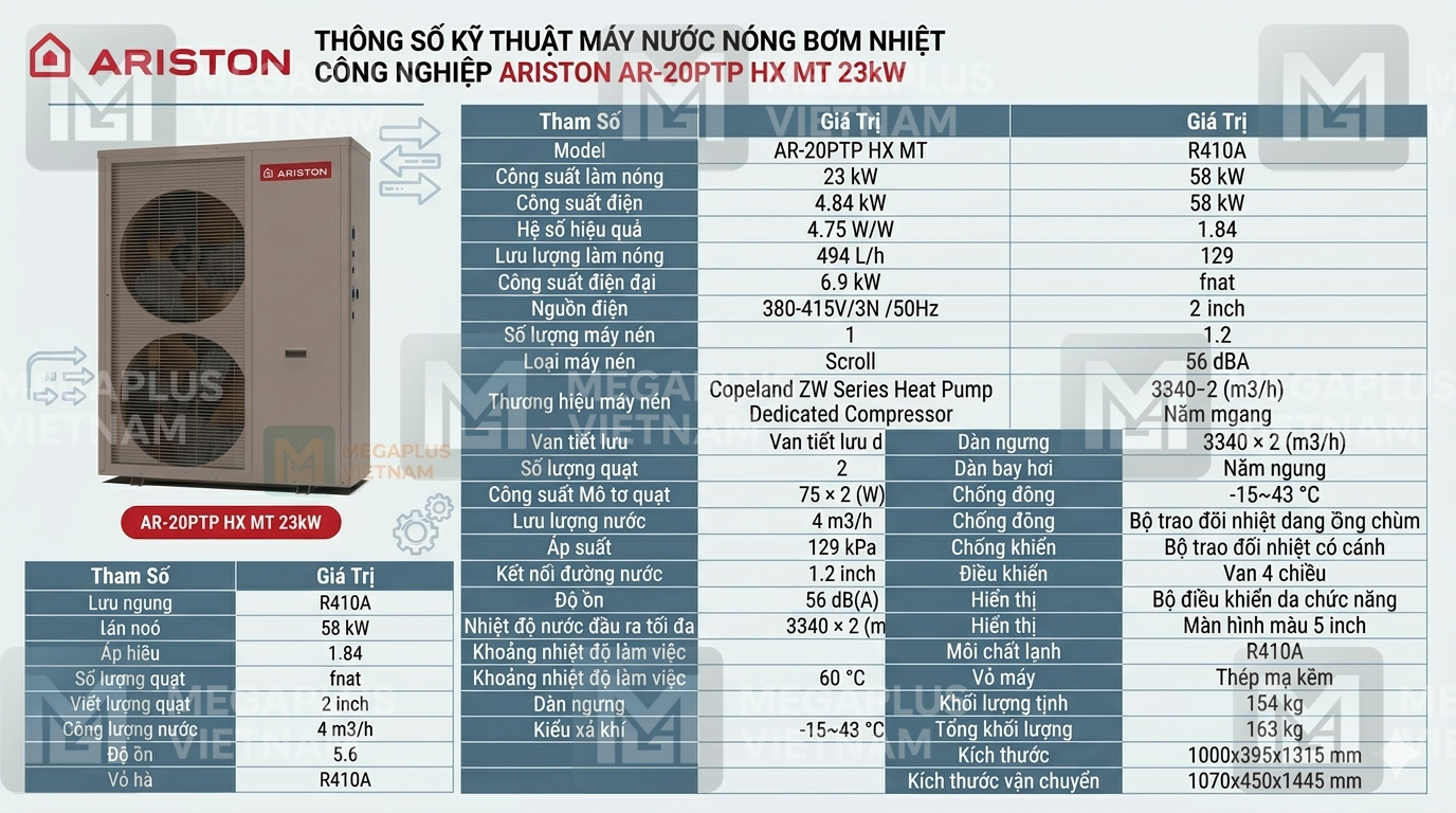 MegaPlus Việt Nam – Đơn vị tiên phong cung cấp giải pháp nhiệt Ariston chuyên nghiệp. Chúng tôi nhận tư vấn, thiết kế và lắp đặt máy nước nóng bơm nhiệt Ariston AR-20PTP HX MT 23kW cho dự án trên toàn quốc: