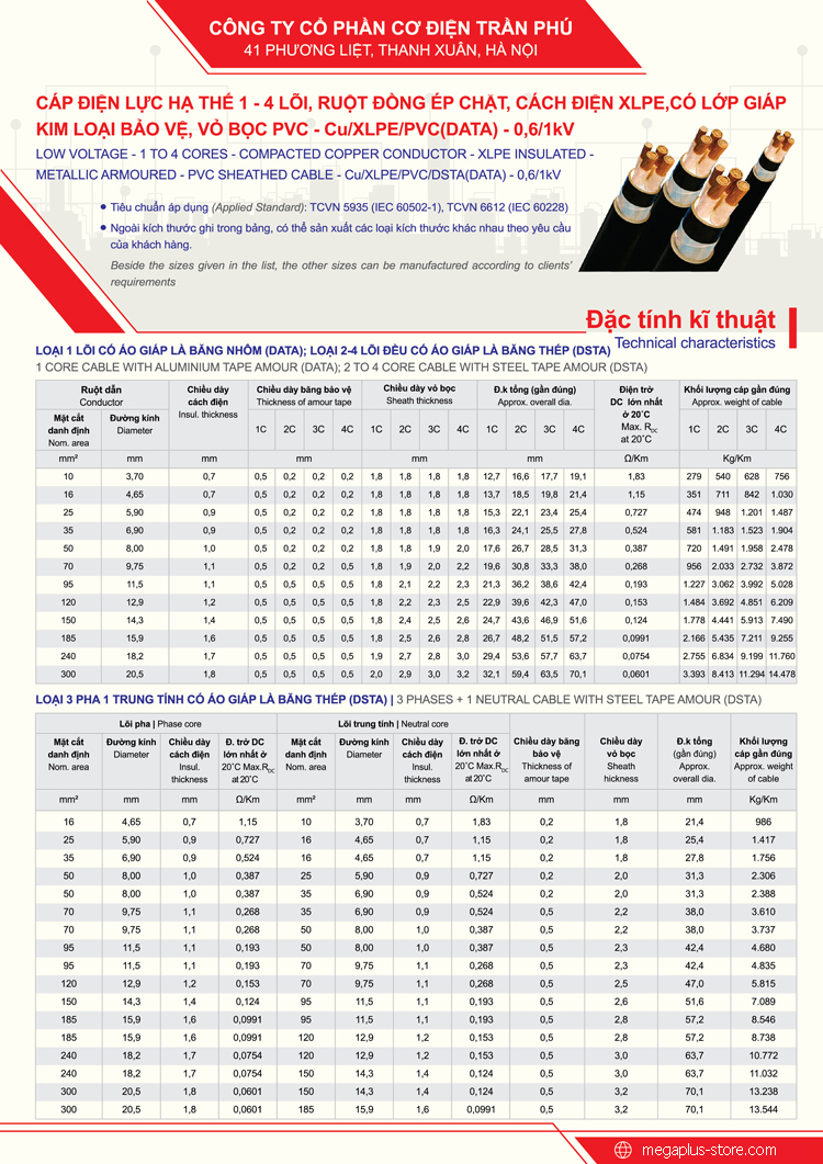 Cáp điện lực hạ thế có 1 – 4 lõi, ruột đồng ép chặt, cách điện XLPE, có lớp giáp kim loại bảo vệ, vỏ bọc PVC. Mã số của sản phẩm: CU/XLPE/PV (DATA). Dây được dùng trong phân phối điện công nghiệp, lắp đặt cố định. Tiêu chuẩn áp dụng theo TCVN 5935 (EC 60502-1), TCVN 6612 (IEC 60228)