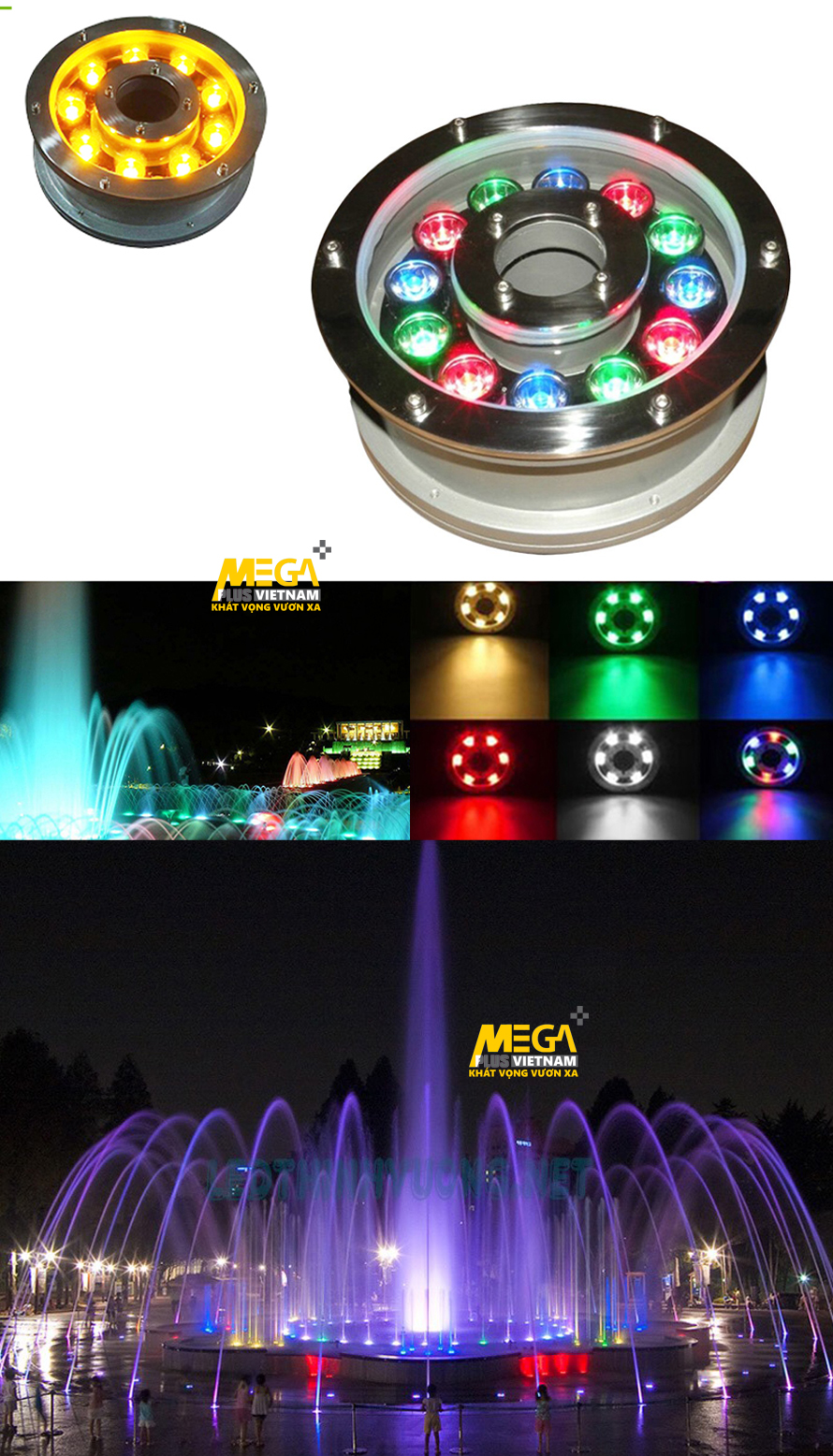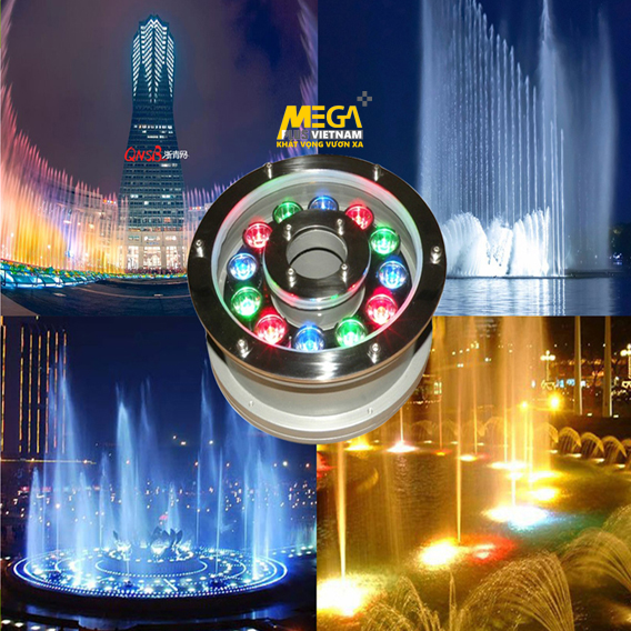 - Đèn âm nước IP68 đồi màu cao cấp 3W-36W của MegaPlus Việt Nam cung cấp là sản phẩm chất lượng cao thường được sử dụng những công trình có bể nước, đài phun nước và bể bơi. Đèn sử dụng chip công nghệ tiêu chuẩn USA và EU ưu việt với ánh sáng chất lượng cao. Nguồn led từ Đài Loan với dải công suất cao giúp đèn hoạt động ổn định trong thời gian dài. Đèn với tiêu chuẩn chống nước theo quy định .