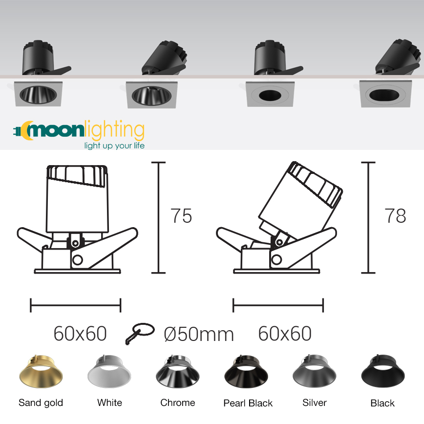 - Đèn LED COB Downlight âm trần điều chỉnh góc chiếu có nhiều màu sắc để khách hàng dễ dàng lựa chọn: Vàng cát ( Sand Gold), Đen ngọc trai (Pearl Black), Đèn (Black), Trắng(White), Bạc(Silver), Chrome