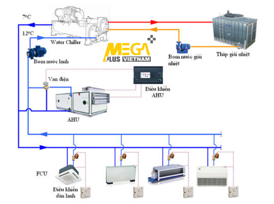 - Hệ thống điện điều khiển: Là hệ thống điều khiển khống chế liên động các thiết bị trong hệ thống (Máy lạnh, FCU, Bơm nước và tháp giải nhiệt)