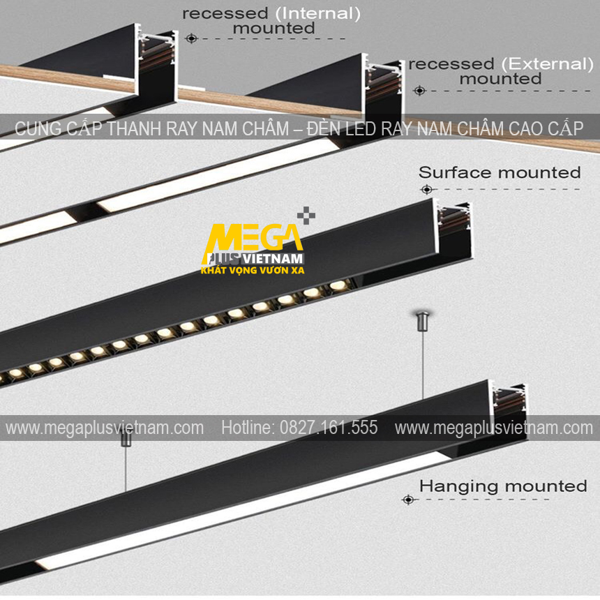 - Hệ thống đèn ray nam châm vể cơ bản có 3 loại Thanh ray nam châm và được thi công lắp đặt thanh ray nam châm theo từng loại Thanh ray nam châm khác nhau.