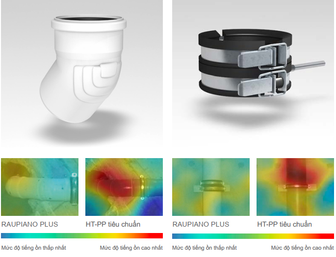 - Công nghệ nhiều lớp giúp giảm thiểu đáng kể các mức độ âm thanh: Lớp giữa có độ cứng cao của các ống RAUPIANO PLUS với các chất khoáng làm miếng đệm hấp thụ âm thanh làm tăng mật độ của vật liệu (mật độ đường ống 1.9g/cm3), giúp làm giảm đáng kể mức độ âm thanh. Tất cả các thành phần của RAUPIANO PLUS - các đường ống, các chi tiết đúc và thiết bị lắp đặt - đều loại bỏ tiếng ồn một cách hiệu quả