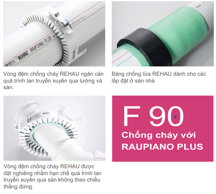- Các giải pháp chống cháy của REHAU: Trên nhiệt độ 160°C, vật liệu đặc biệt của vòng đai lửa REHAU sẽ nở ra gấp 18 lần so với kích thước bình thường, bịt kín hoàn toàn đường ống, đảm bảo ngăn không cho lửa, khói và khí ga phát tán sang các phòng gần kề.