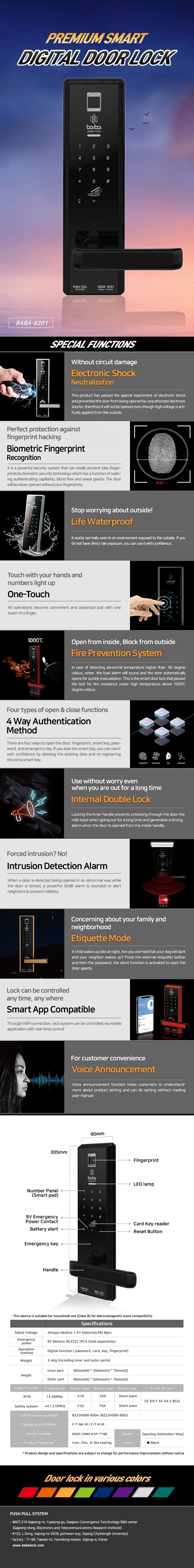 - Thiết bị khóa cửa vân tay Baba 8201 là sản phẩm mới của hãng sản xuất, được cải tiến về phương thức mở khóa thông minh so với các Model cũ, cũng chính là các phương thức tiên tiến số 1 hiện nay: vân tay, thẻ từ, mật mã, chìa cơ, wifi/bluetooth. Khiến việc mở khóa trở lên đơn giản và thuận tiện.