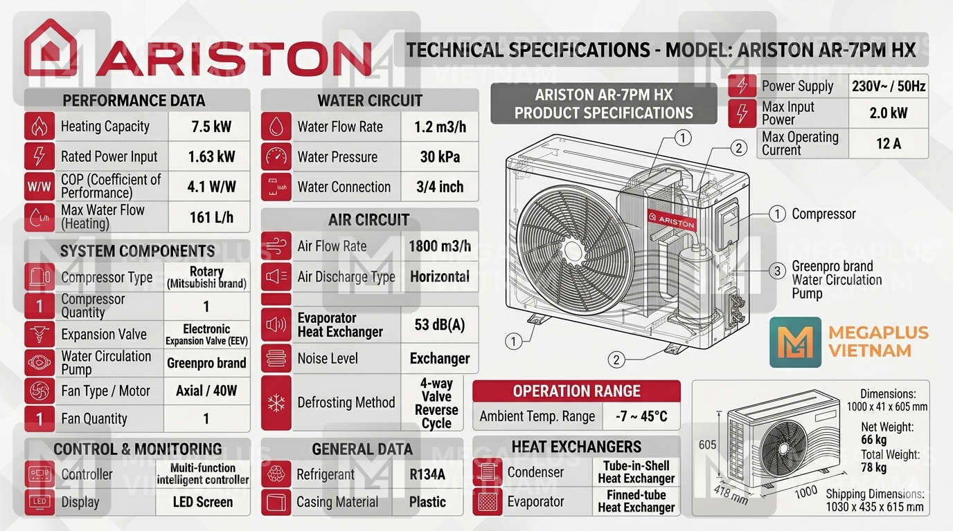 Với kinh nghiệm thực chiến trong việc triển khai Giải pháp nước nóng trung tâm công suất lớn cho khách sạn, resort và nhà máy, MegaPlus Việt Nam cam kết mang đến hiệu suất năng lượng tối ưu nhất cho dòng Heat Pump Ariston AR-7PM HX: