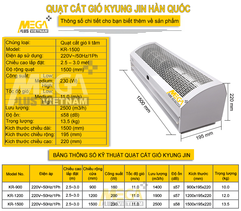 - Quạt cắt gió KyungJin KR-1500 lưu lượng gió thổi là 2300m3/giờ và điện áp 220V/50Hz/1phase.