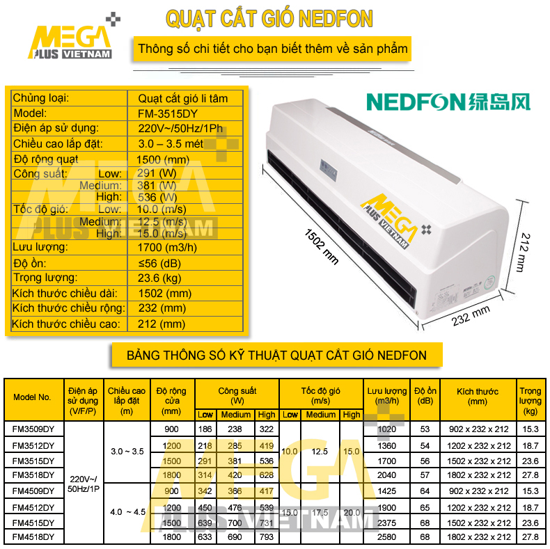 Thông số kỹ thuật Quạt Cắt Gió NEDFON FM3515DY, Quạt chắn gió NEDFON FM3515DY