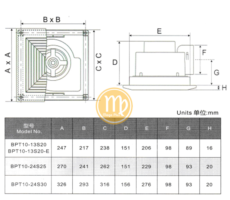 Thông số kích thước của sản phẩm Quạt thông gió âm trần ống nối Nedfon BPT10, Quạt thông gắn trần ống nối Nedfon BPT10