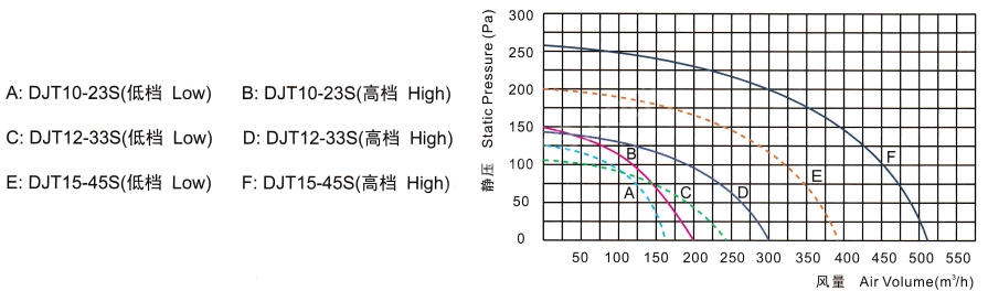 Biểu đồ lưu lượng gió Quạt Thông Gió Âm Trần Ống Nối Nedfon DJT Seril