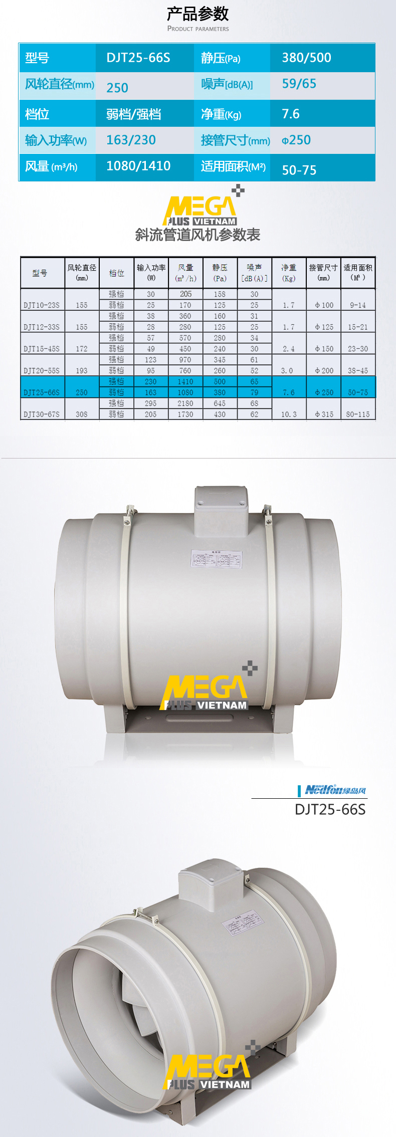 Quạt Thông Gió Âm Trần Ống Nối Nedfon DJT25-66S, Quạt Thông Gió In-line Nedfon DJT25-66S