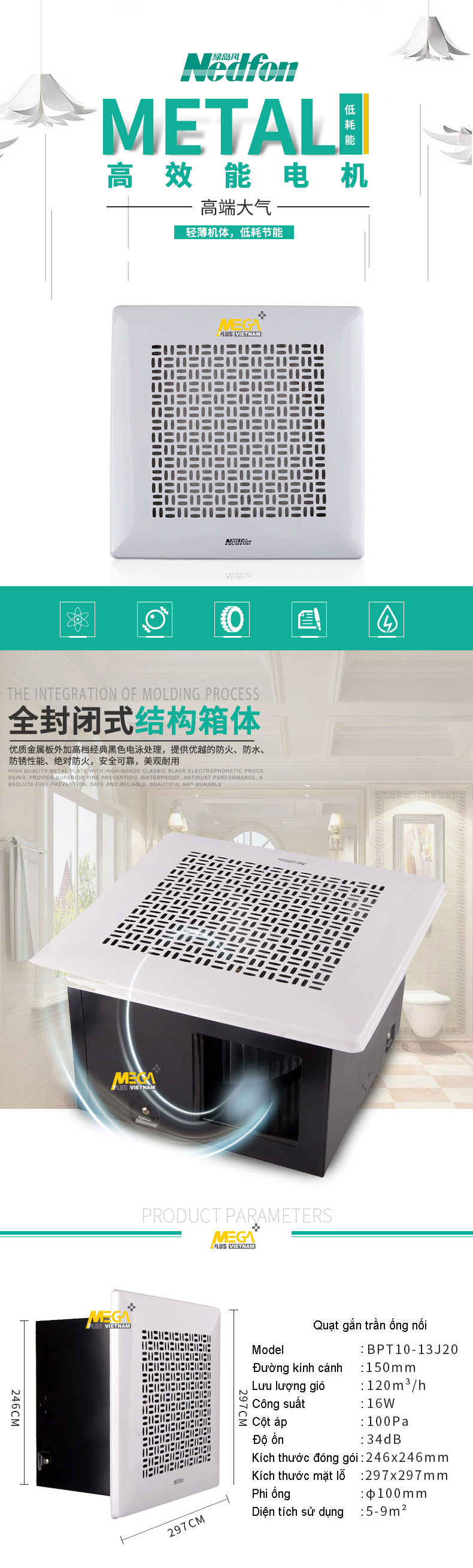 Thông số kỹ thuật Quạt Thông Gió Hút Trần Nedfon BPT10-13J20, Quạt thông gió gắn trần ống nối Nedfon BPT10-13J20