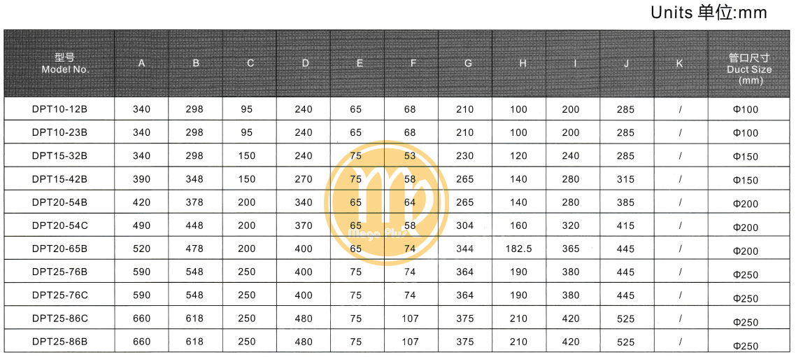 Kích thước các model sản phẩm Quạt thông gió âm trần nối ống Nedfon DPT