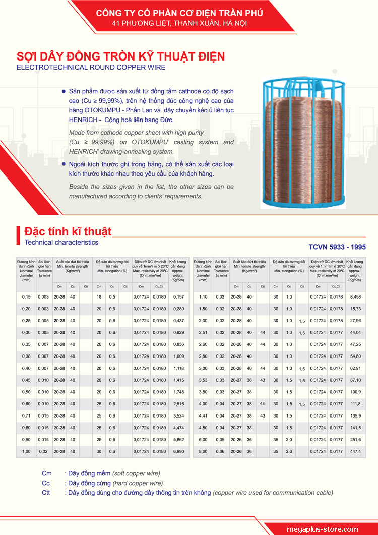 Hãy cùng theo dõi một số đặc tính kỹ thuật của Sợi đồng tròn kỹ thuật điện của Cơ điện Trần Phú trong bảng dưới đây: